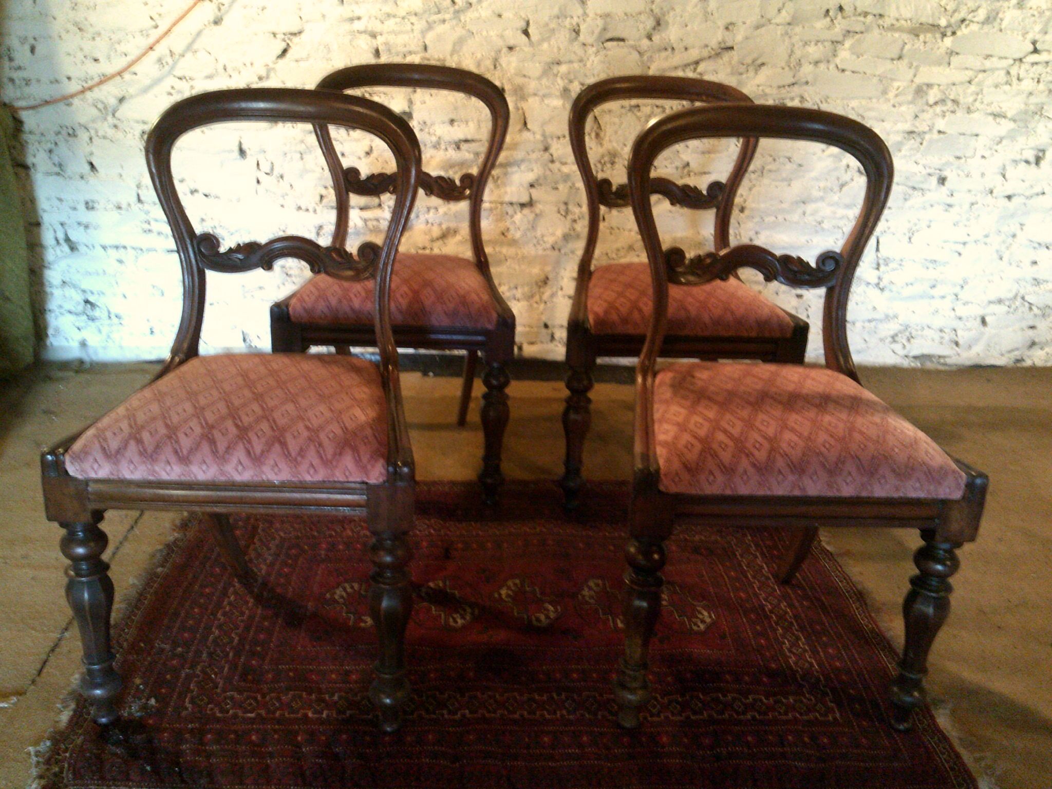 A set of four Victorian mahogany dining chairs with drop-in seats traditionally upholstered in a pink fabric.   Carved mid back member and turned front legs.