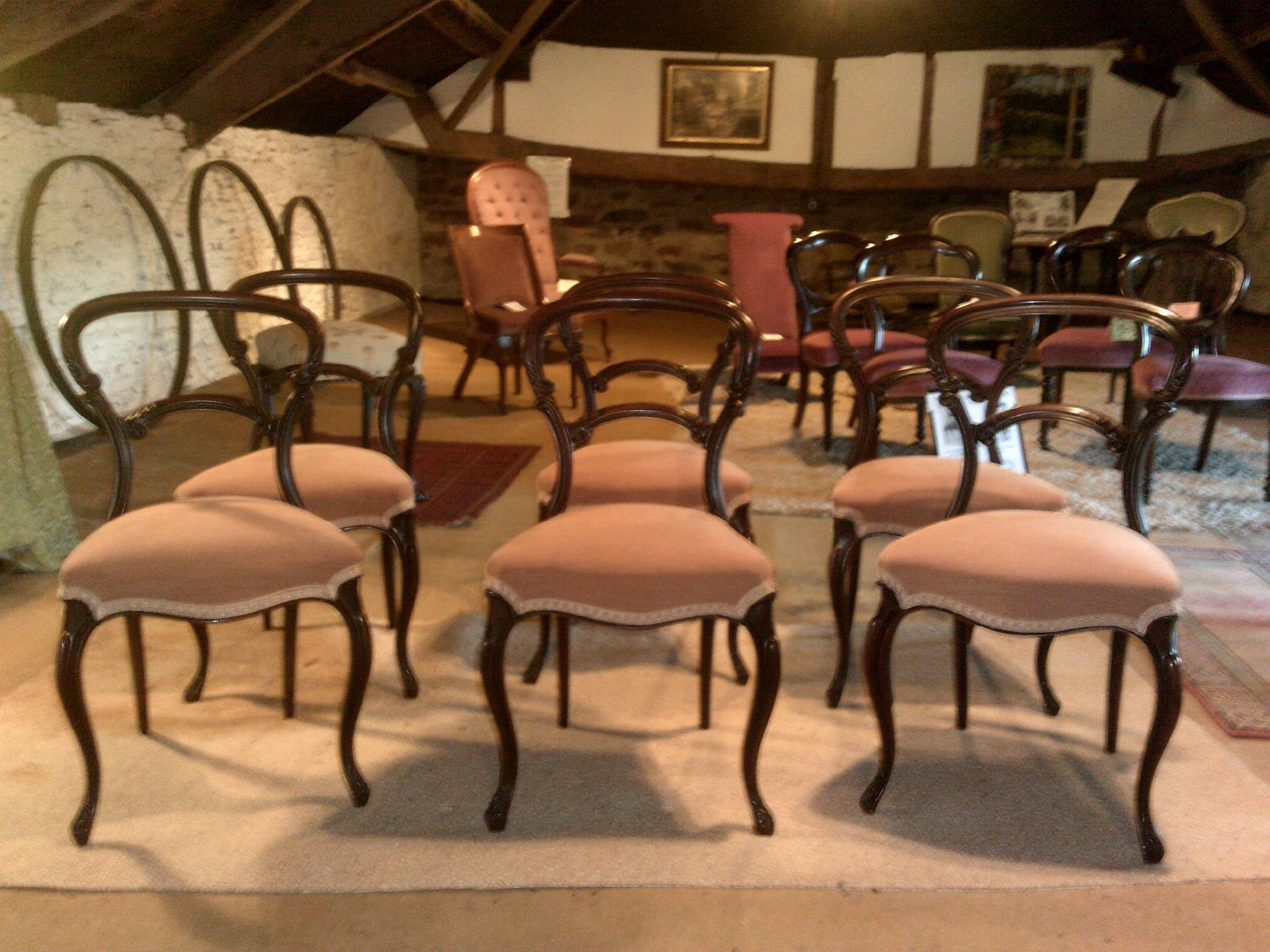 A lovely set of six Victorian rosewood balloon-back dining chairs with stuff-over seats traditionally upholstered in a beige hard wearing fabric. Some carving to front cabriole legs and back.